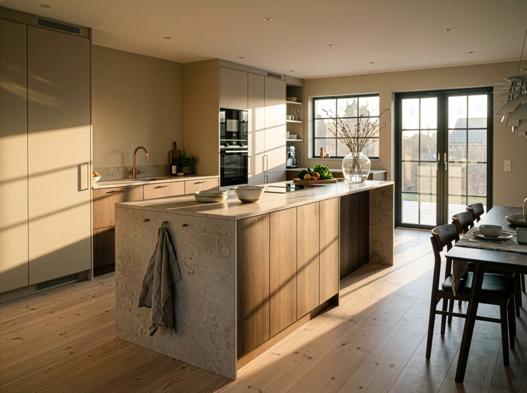 Den sandfärgade kulören fungerar utmärkt tillsammans med både ljusa och mörka bänkskivor i sten, liksom med träslag som ljus ek, mörk ek och valnöt. Den kombineras även fint med svarta eller rostfria detaljer för ett mer grafiskt uttryck. Resultatet blir ett kök i beige som känns mjukt, balanserat och lätt att trivas i – med en varm och naturlig helhet som håller över tid.