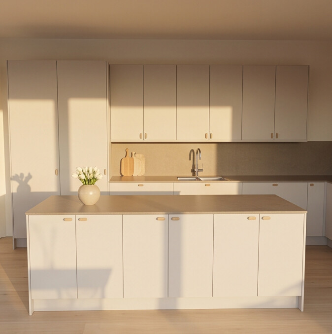 Färgen passar bra för dig som vill skapa ett beige kök med ett lugnt och sammanhållet uttryck. Beiga köksluckor i Vass fungerar fint tillsammans med både ljusa och mörkare bänkskivor, beroende på hur mycket kontrast du vill ha, eller med någon av våra beige bänkskivor för ett kök i ton-i-ton.