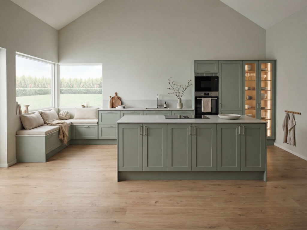 På bilden ser du vår köksmodell Kontur i färgen Duvgrön.