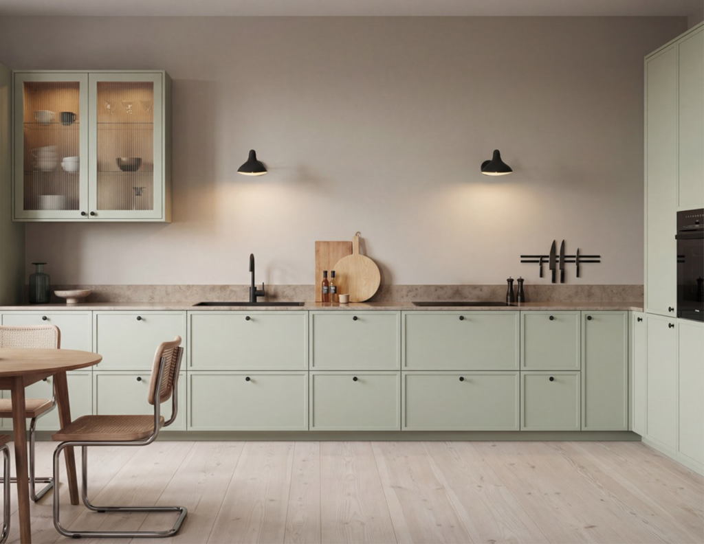 Duvgrön är mycket mångsidig – den passar moderna och klassiska köksmiljöer och kan kombineras med såväl trädetaljer som sten eller metaller.